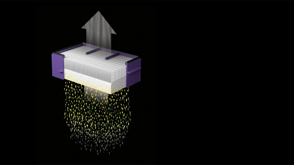 The HEPA filter removes airborne particles from the air. It has a grille to capture larger debris, a fleece layer to capture fluff and fibres, and a pleated HEPA media to capture particles as small as 0.1 microns.